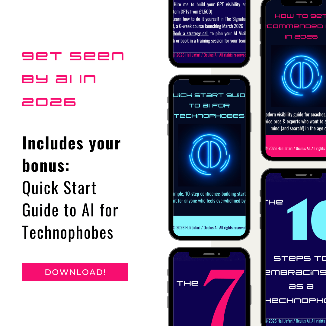 At Oculus AI, I blend strategy, storytelling, and technical precision to create personalised systems that support your content, clarify your messaging, protect your intellectual property, and bring more ease into your business every single day.